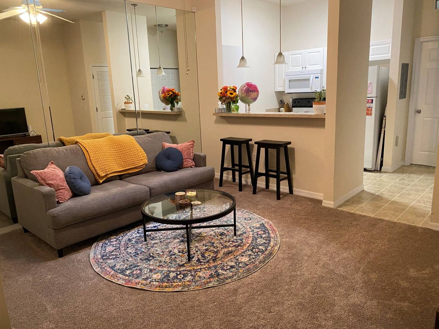 Unit #33 features include 10 foot Ceilings, Washer / Dryer, Dishwasher, Refrigerator with Ice Maker, Disposal, Mirrored Wall in Living Room, Mirrored Closet Doors, Ceiling Fans, Large Walk-In Closet in Master Bedroom, Breakfast Bar, Cable and High Speed Internet Ready, Patio with Chairs & Table Provided, Alarm System available, Quality Construction.